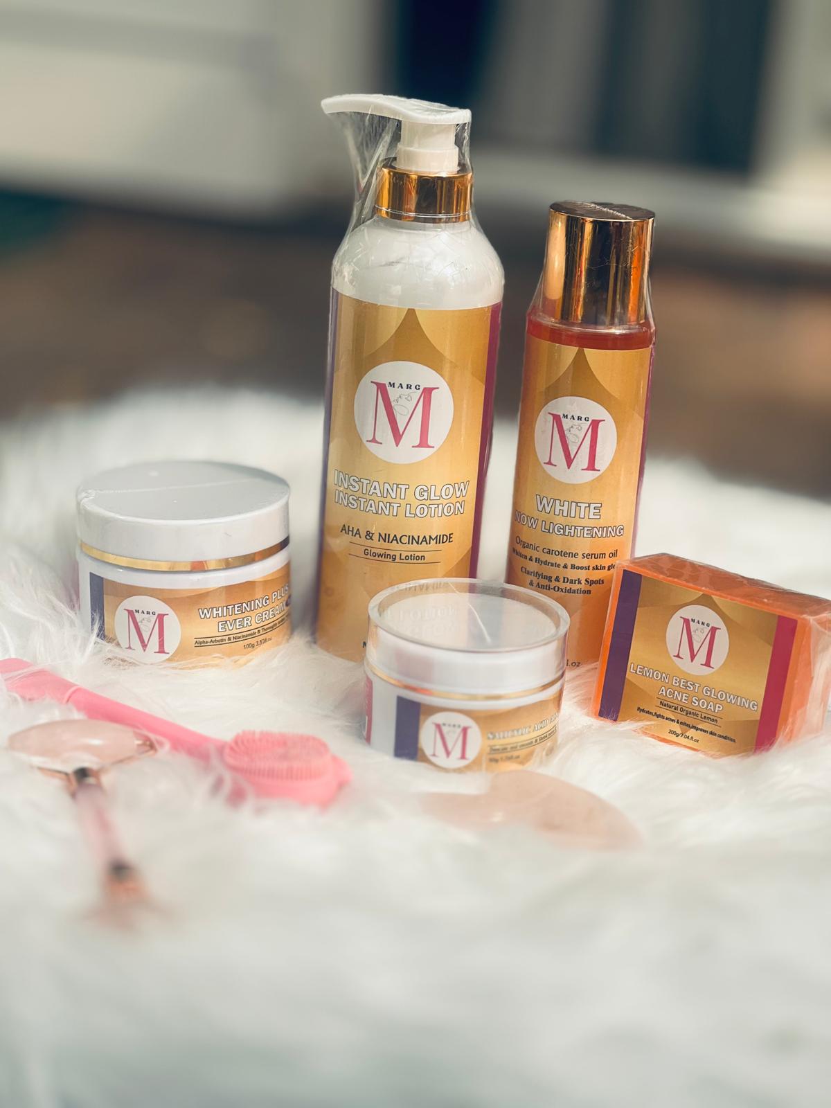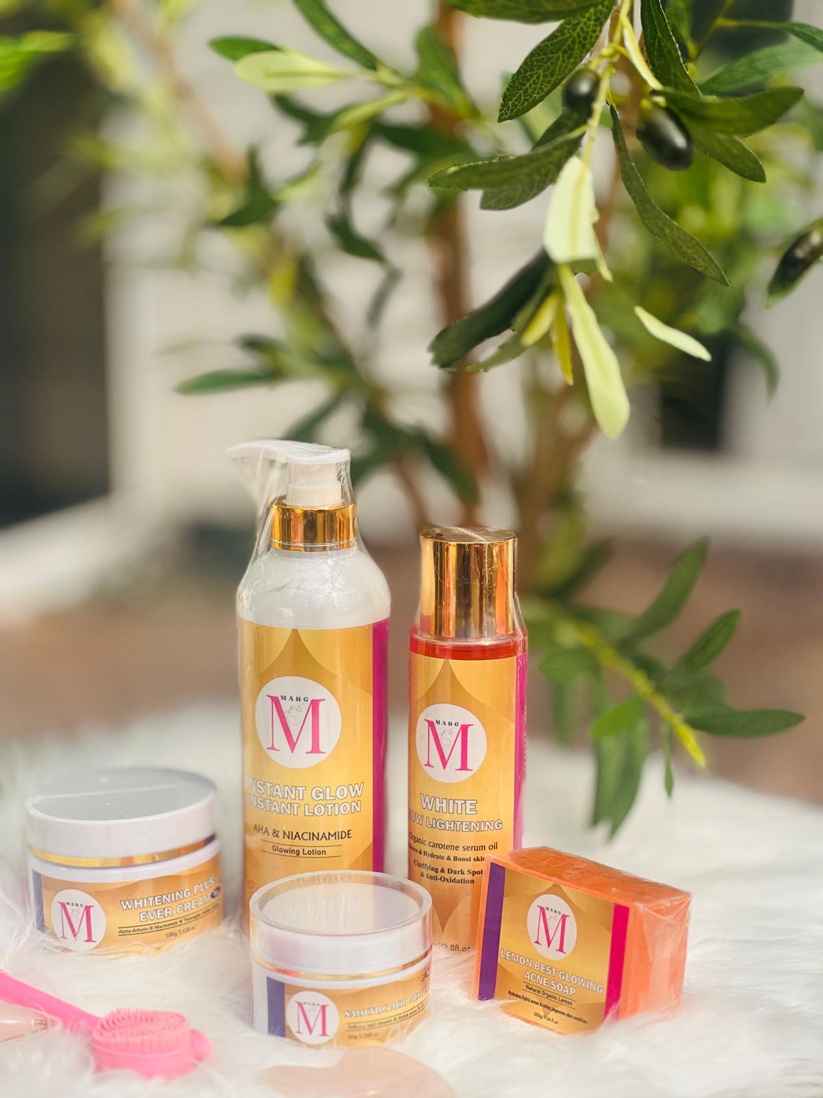 AHA Marg set de 5 pièces: 1 savon 200g ( soap) 1 crème pour le jour 100g (day cream )   crèrme pour la nuit 50g ( anti-acne night cream)  ) 1  serum 250ml ( body serum oil)  1 lotion pour le corps 500ml (body lotion ).